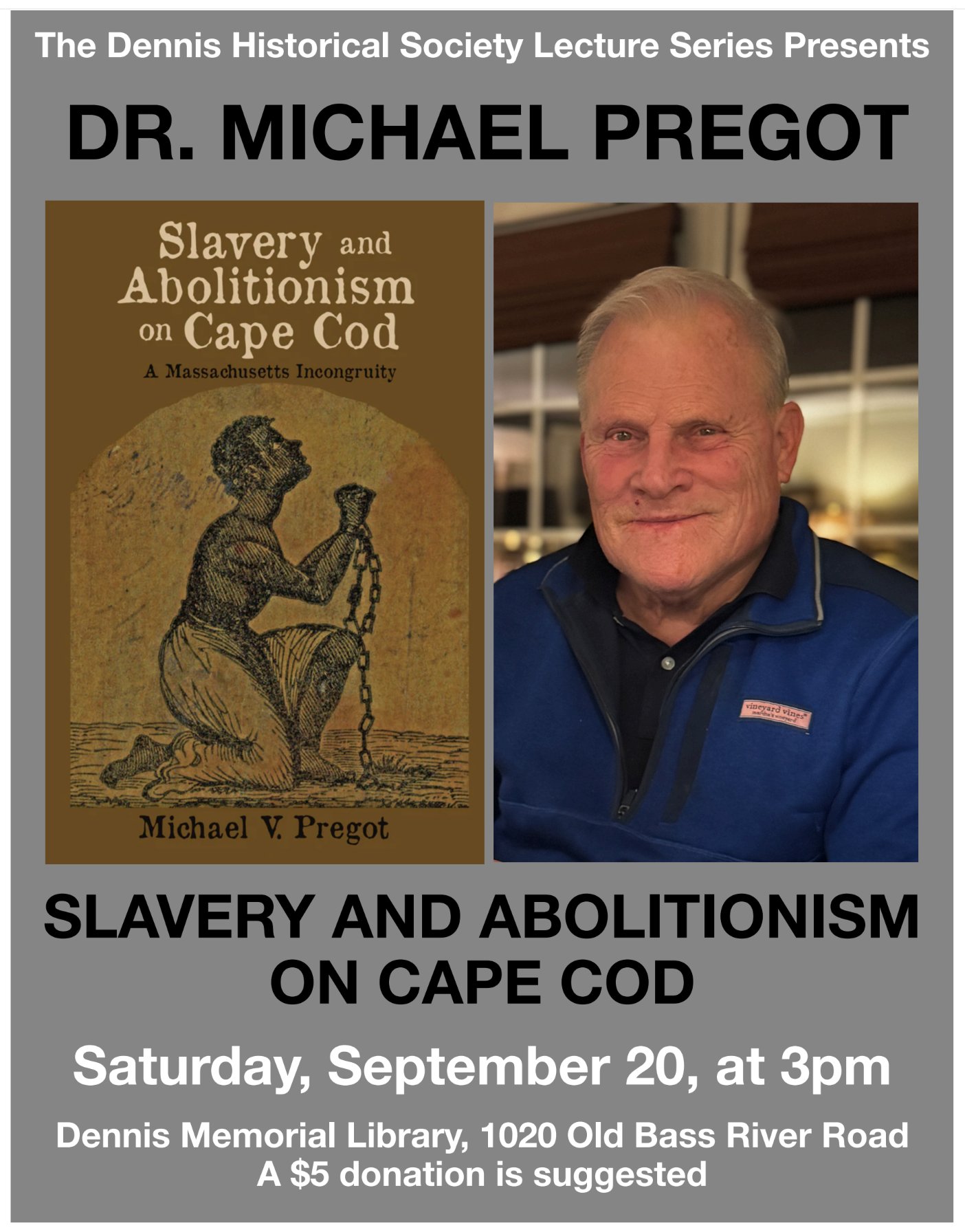 Well known author and educator Dr. Michael Pregot will speak about Cape Cod during this important chapter in American history - book signing after the talk. $5.00 donation appreciated.
